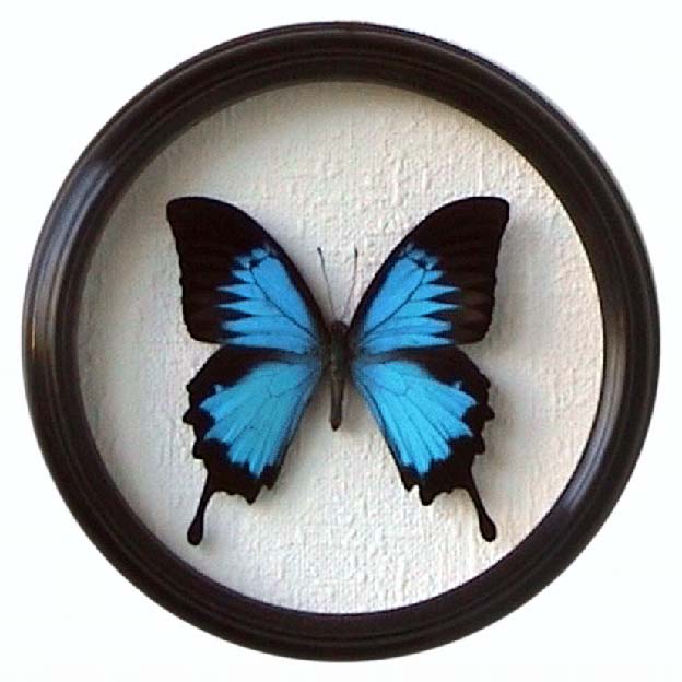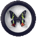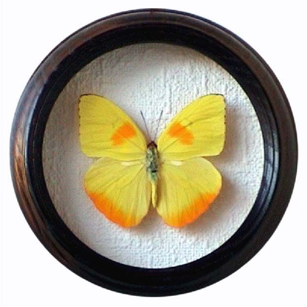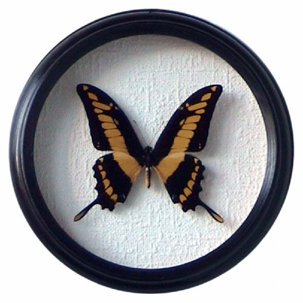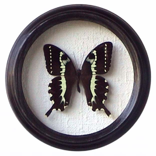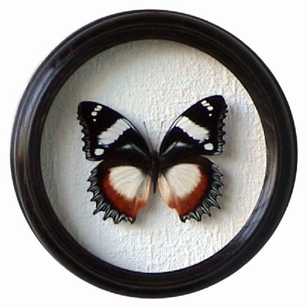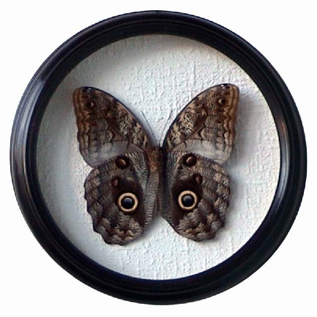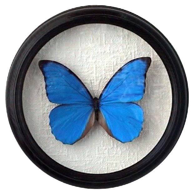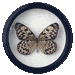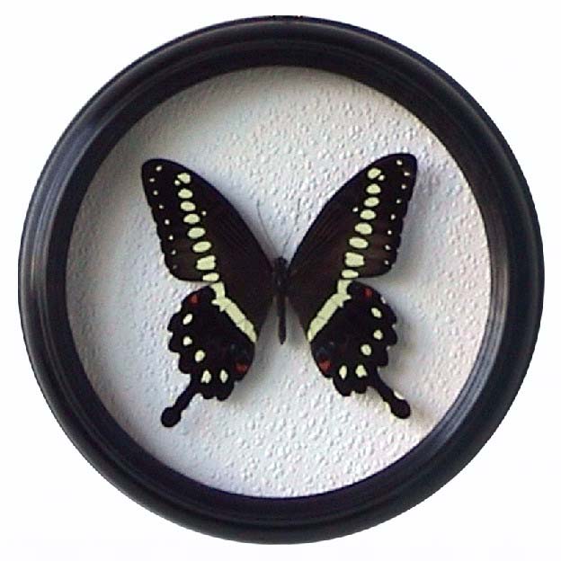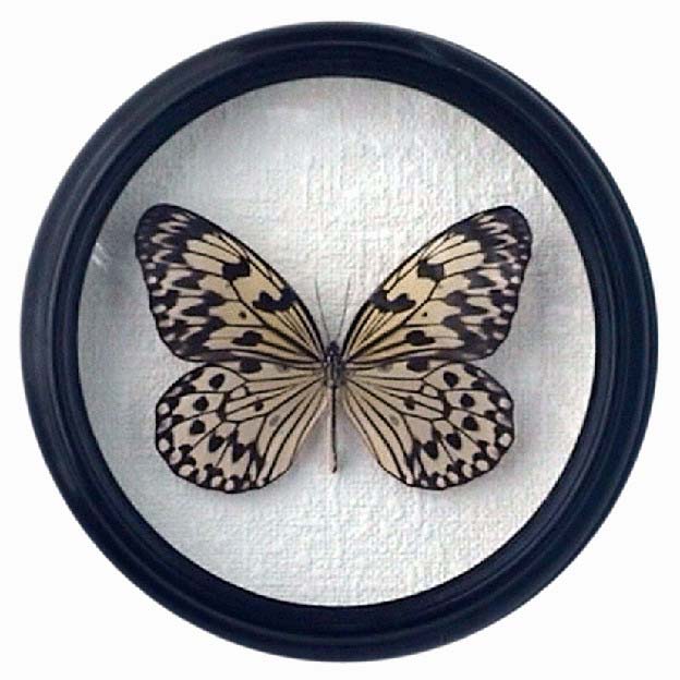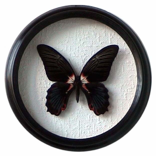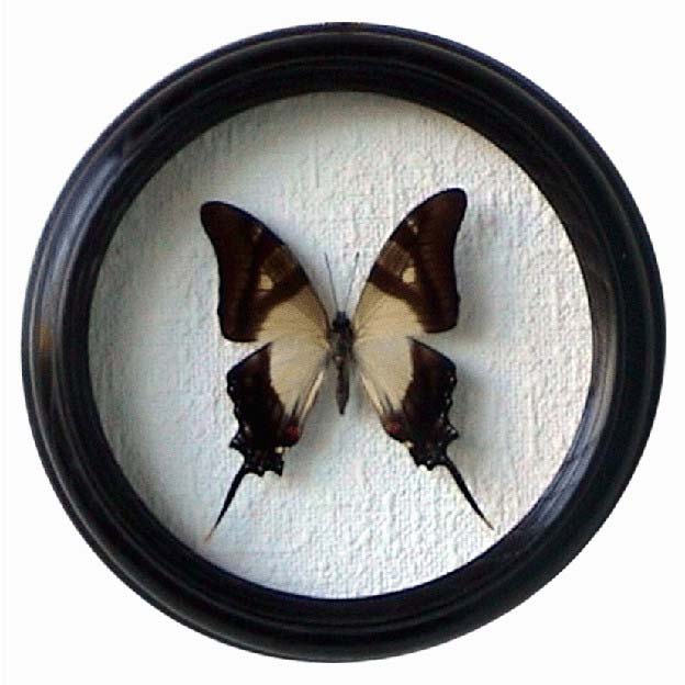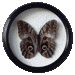 Бабочки предлагаются в коричневой прямоугольной раме (пластиковая рама) и деревянных круглых рамах ( диаметр сувенира - 15см - 30см).