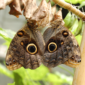 Caligo- все бабочки этого рода имеют на исподе крыльев глаза совы и резко открывая крылья они так отпугивают мелких птиц. Они очень любят лакомиться перезревшими плодами бананов.