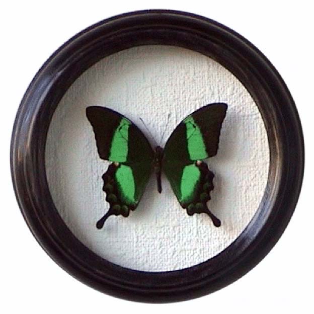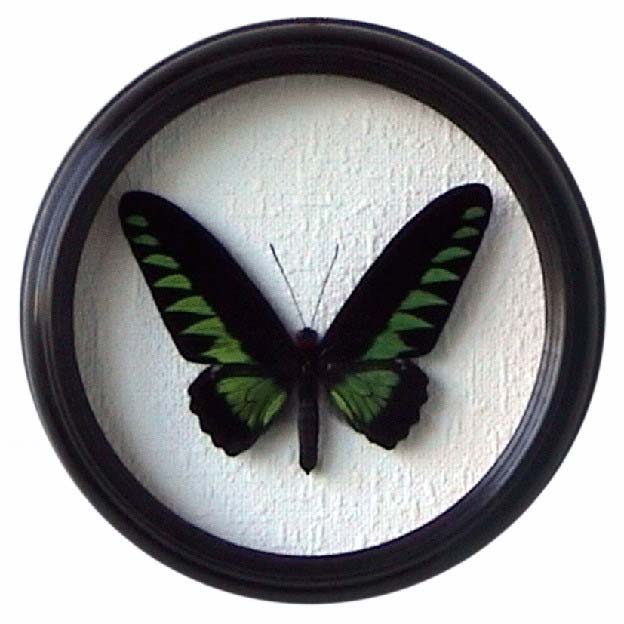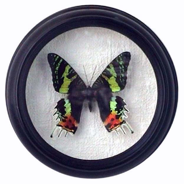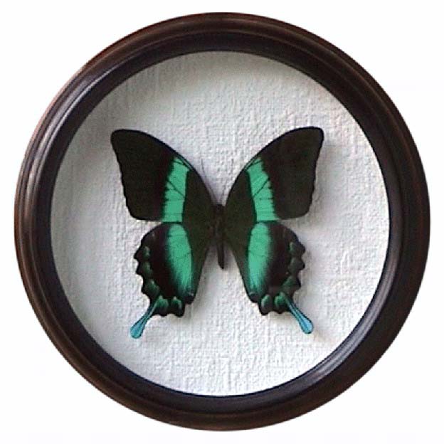Бабочки предлагаются в коричневой прямоугольной раме (пластиковая рама) и деревянных круглых рамах ( диаметр сувенира - 15см - 30см).